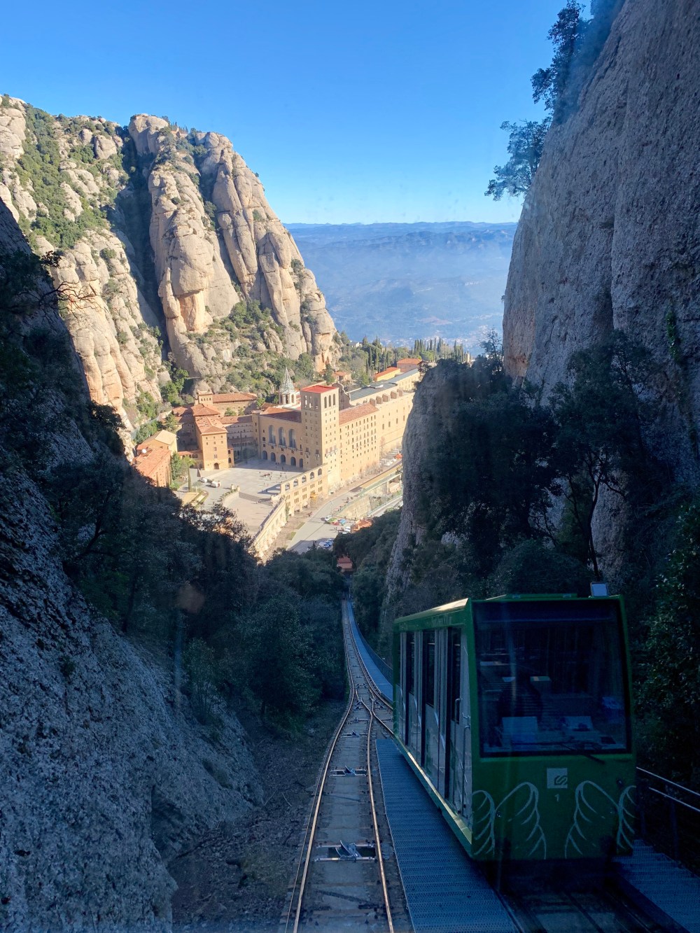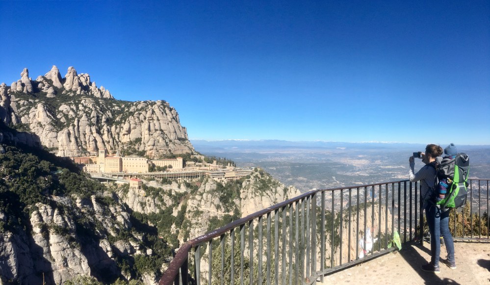 Als wir an der katalanischen Hauptstadt vorbeifahren, entdeckt Uwe am Horizont ein gewaltiges Felsmassiv und reißt spontan das Lenkrad herum. Quietschend biegen wir gerade noch in die Ausfahrt nach Montserrat ein. Ein schneller Blick bei Google (ist einfach NOCH schneller als der Reiseführer) verrät, dass ganz oben auf diesem Berg ein berühmtes Kloster thront. Nun, man kann jetzt nicht sagen, dass wir in den letzten Tagen einen Mangel an Klöstern zu bedauern hätten, aber so eine spektakuläre Lage reizt uns dann doch.