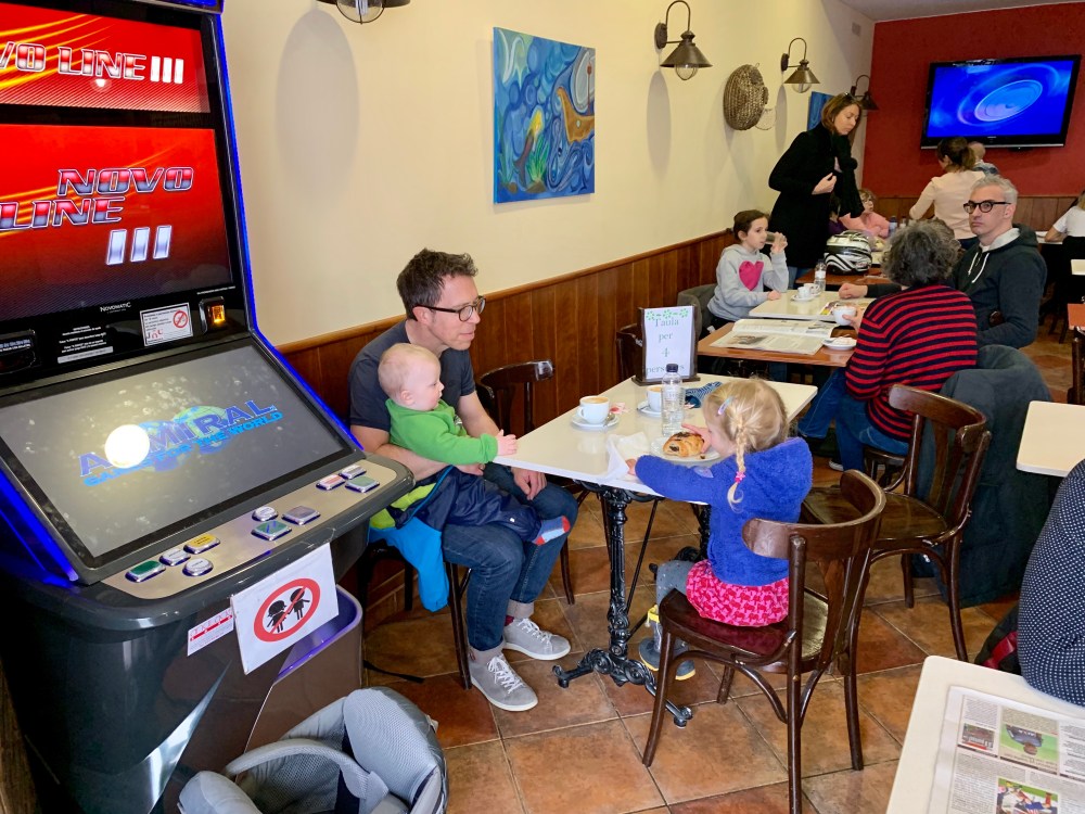 Glücklicherweise finden wir nach ewiger Suche und mittlerweile quengelnden Kindern („Ich will jetzt mein Croissant!“) die einzige geöffnete Bar weit und breit. Hier herrscht ein komplett anderes Flair als in den französischen Frühstückscafés, aber es gibt immerhin Tostadas mit Schinken oder Marmelade und starken Café con Leche.