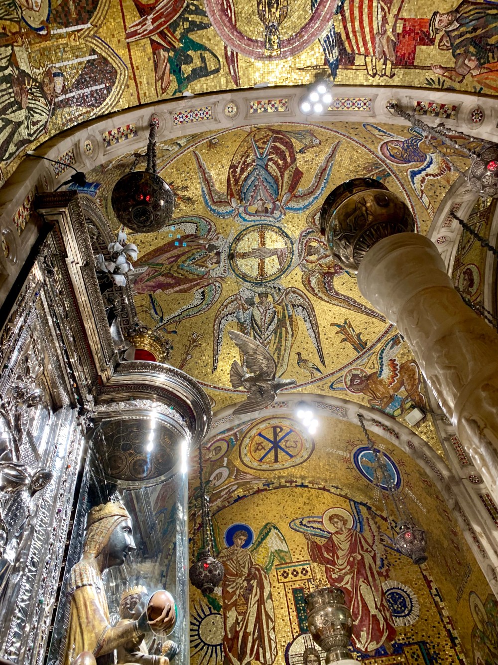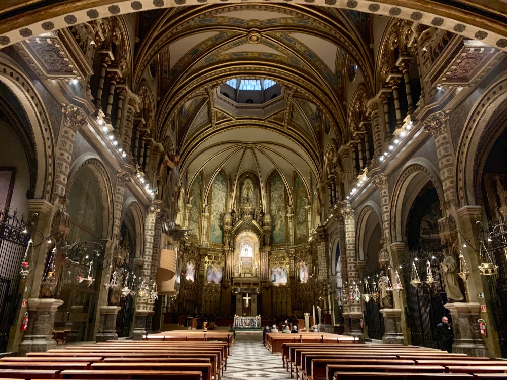 Da es noch nicht ganz 18 Uhr ist, betreten wir vorsichtig die menschenleere Klosteranlage von Montserrat. Die riesige goldgeschmückte Basilika verschlägt uns den Atem.